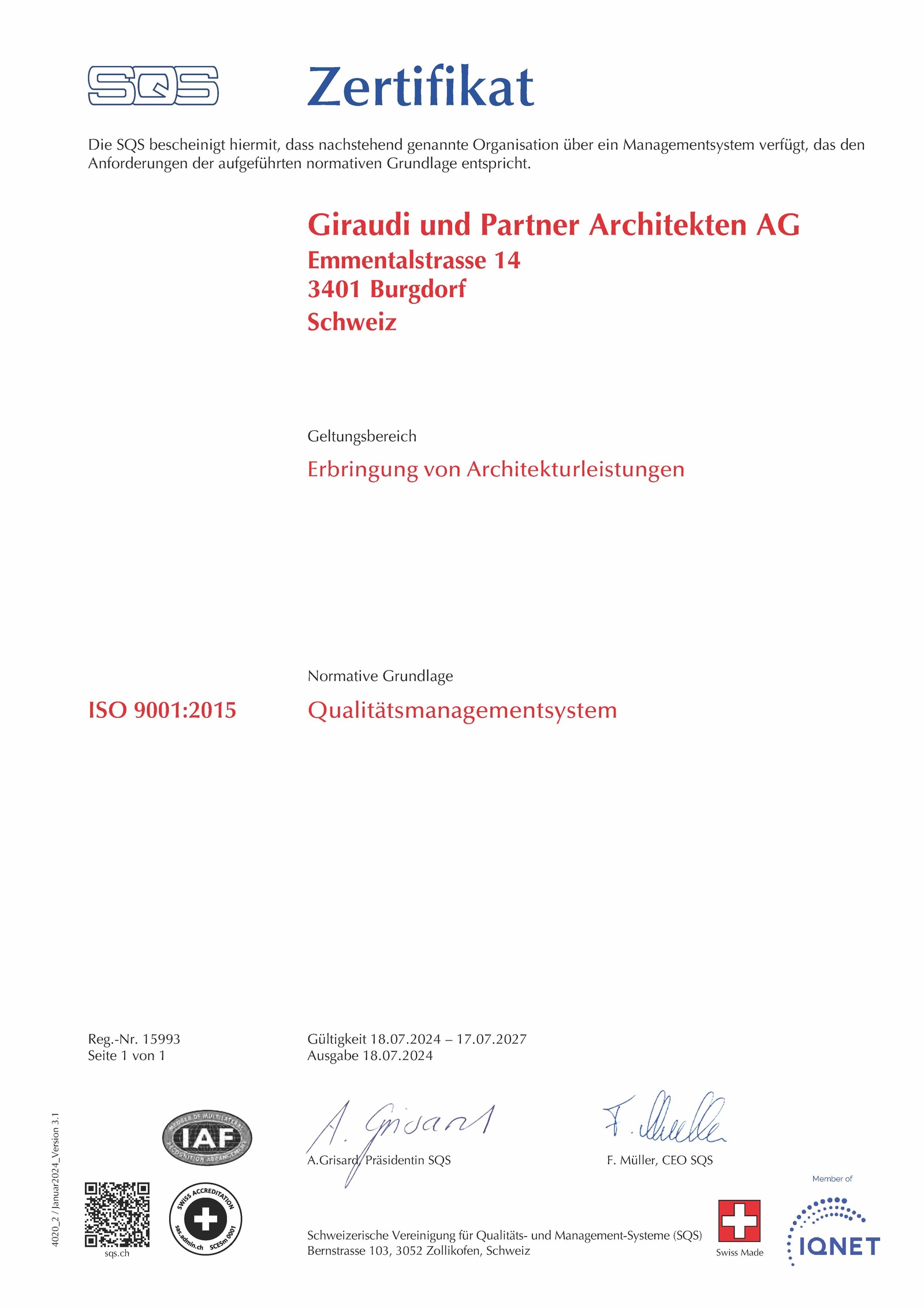 Das Einhalten höchster Qualitätsnormen wird mit dem SQS Zertifikat ISO bestätigt.