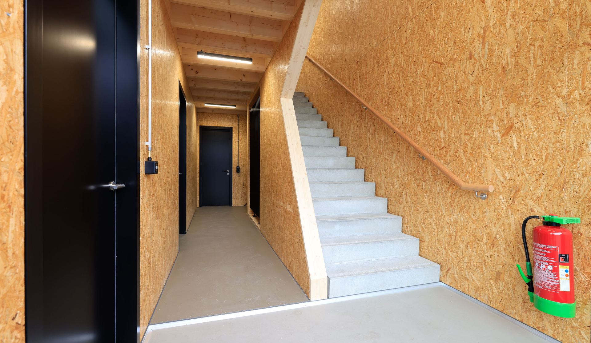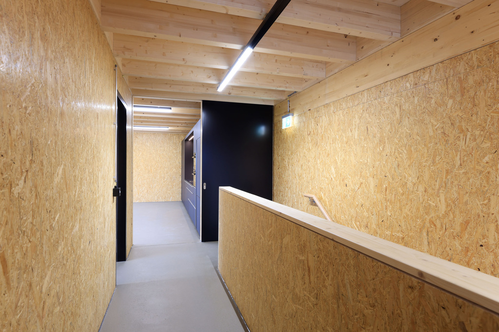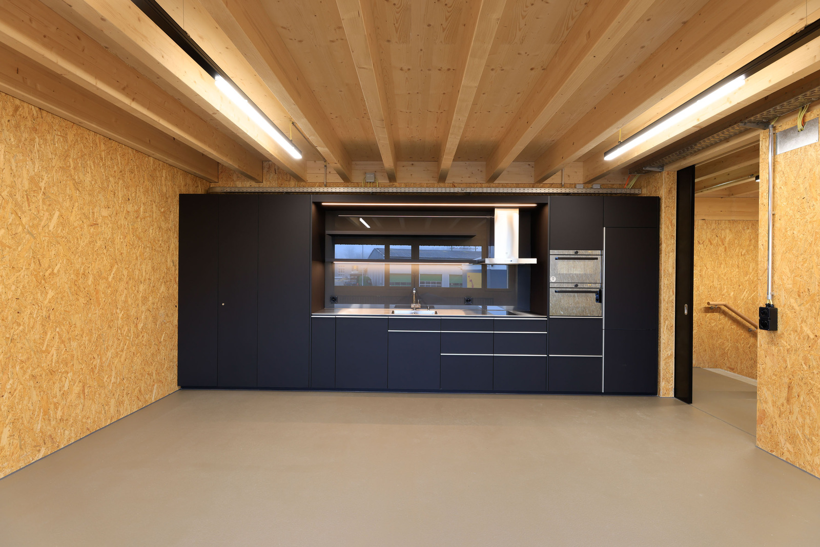Die ehrliche Materialität prägt den Bau. Die Gebäudehülle bildet eine hinterlüftete, sägerohe und vertikale Holzschalung. Im Innenraum ist die Konstruktion zugleich die Oberfläche. Die Bodenplatte in Monobeton, Wand und Decke in unverkleideter Holzrahmenbauweise erzeugen die Raumstimmung. Der Verzicht auf Verkleidungen und Veredelungen sorgen für eine sachgerechte Ökologie.