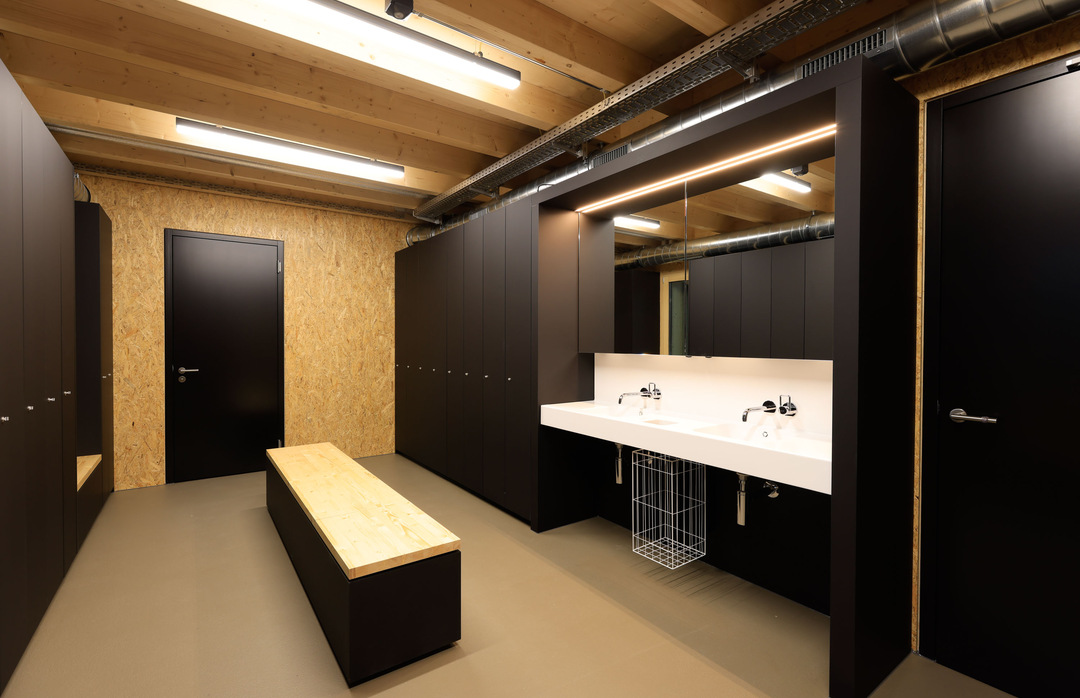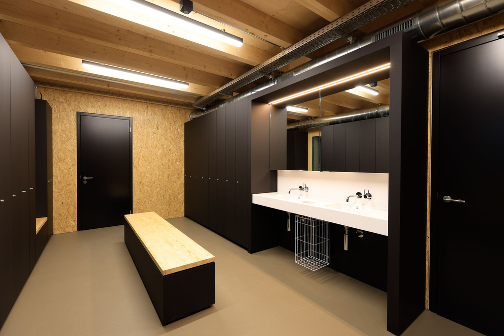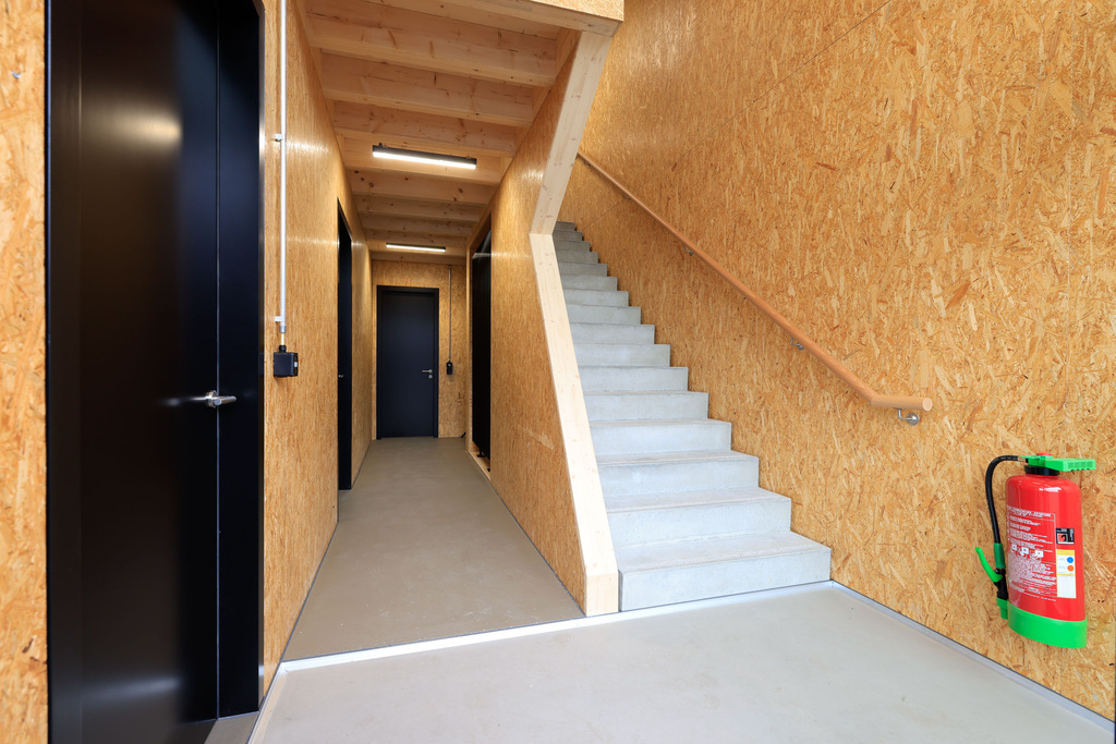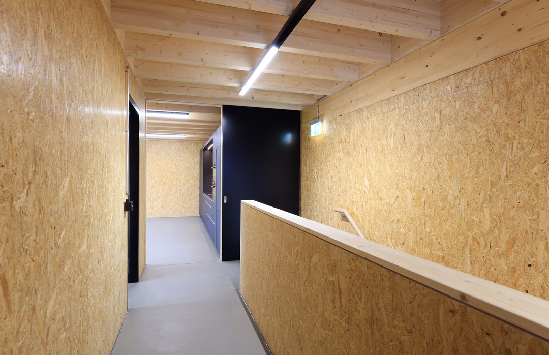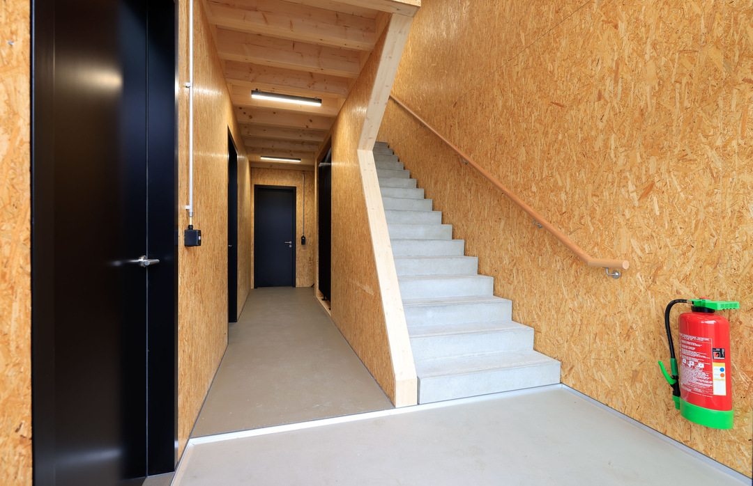 Die ehrliche Materialität prägt den Bau. Die Gebäudehülle bildet eine hinterlüftete, sägerohe und vertikale Holzschalung. Im Innenraum ist die Konstruktion zugleich die Oberfläche. Die Bodenplatte in Monobeton, Wand und Decke in unverkleideter Holzrahmenbauweise erzeugen die Raumstimmung. Der Verzicht auf Verkleidungen und Veredelungen sorgen für eine sachgerechte Ökologie.