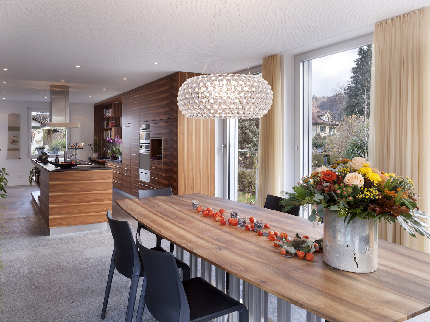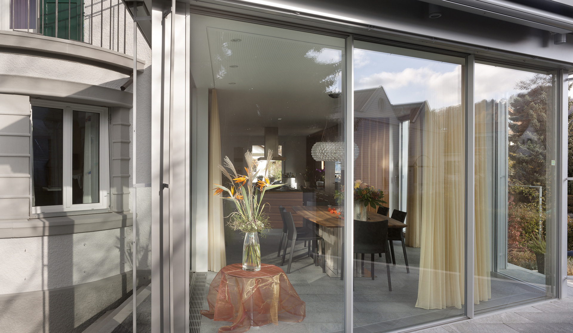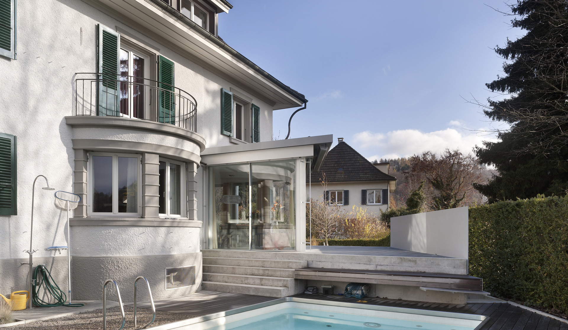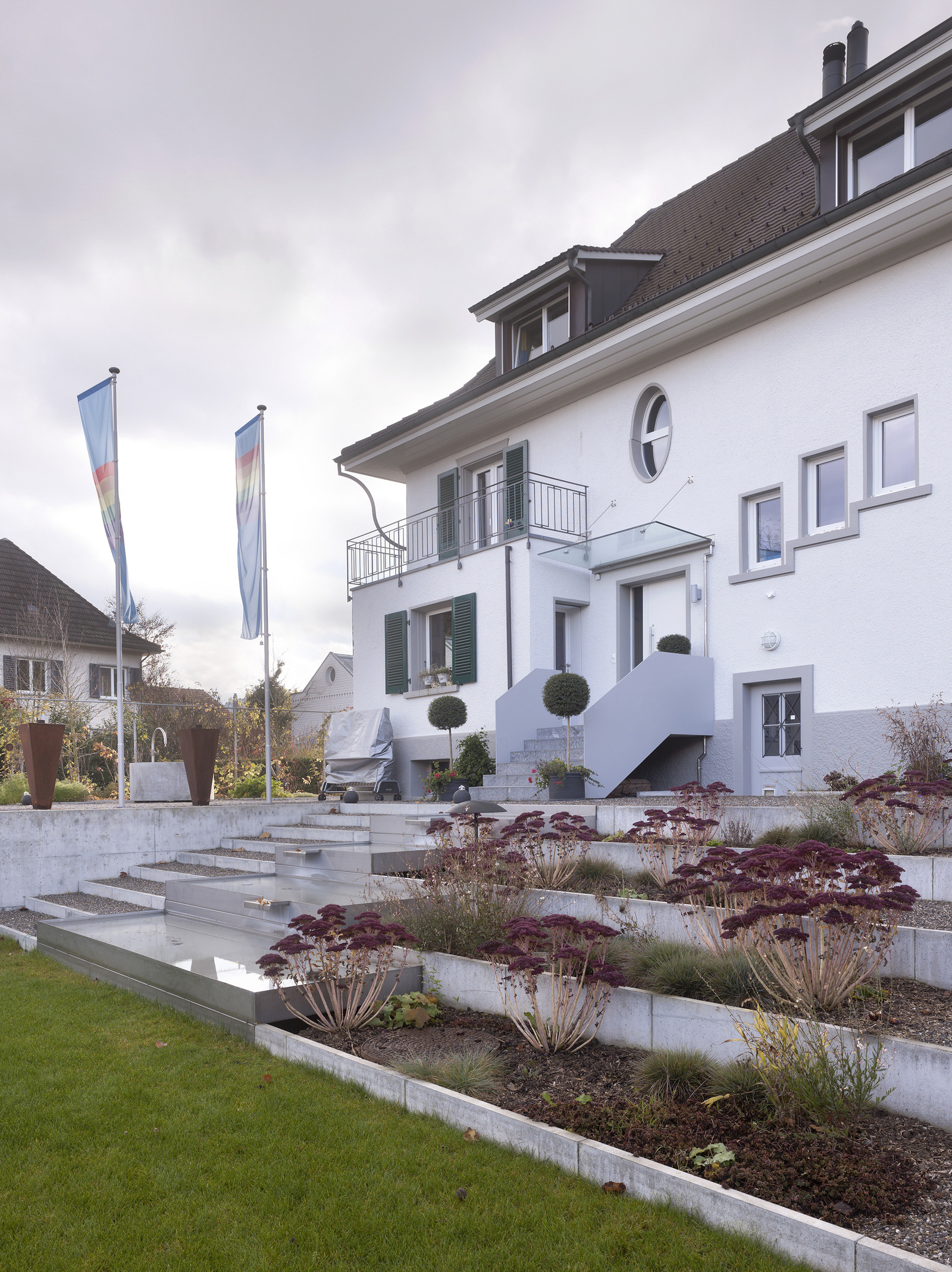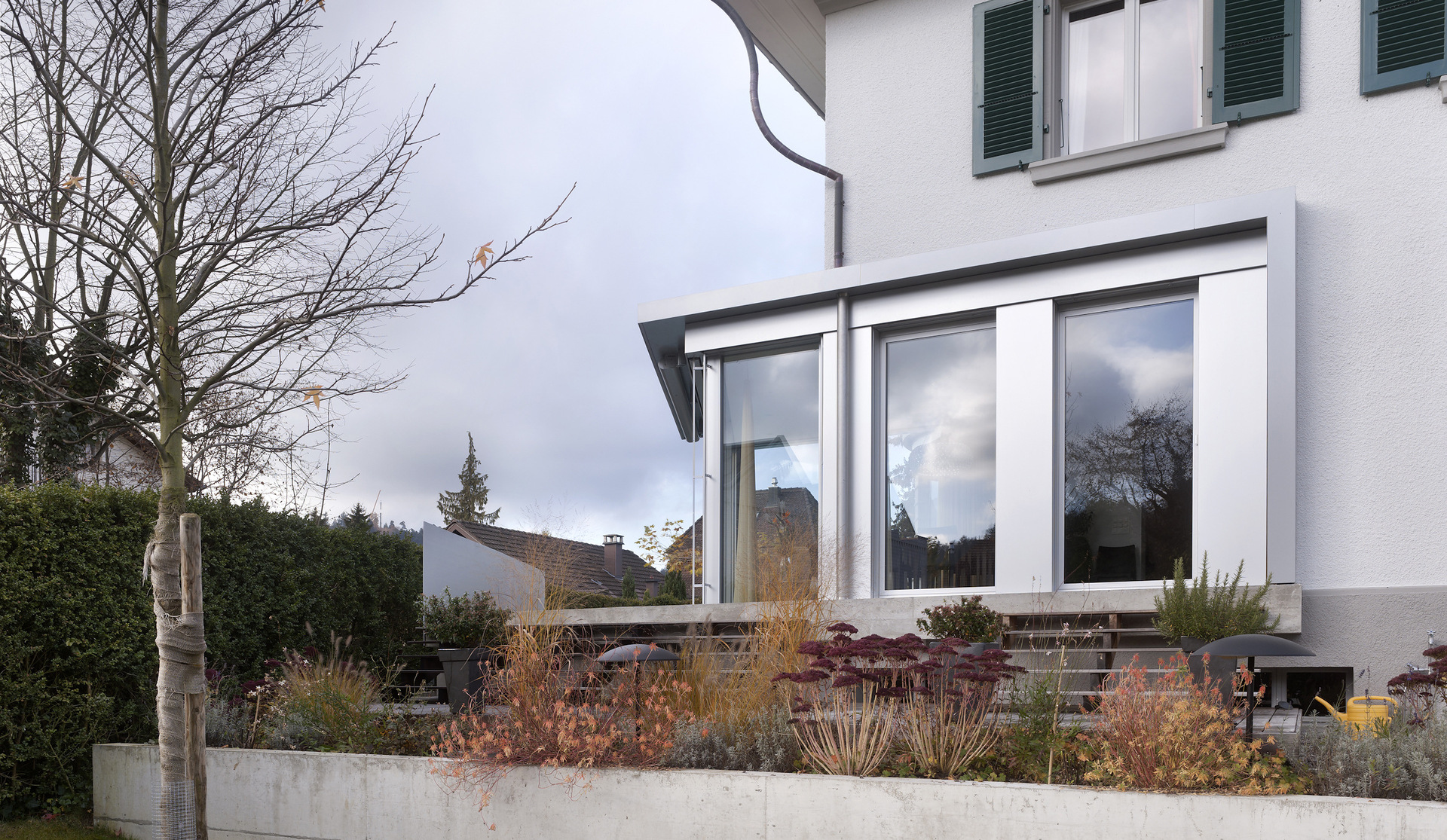 Bei einer bestehenden Liegenschaft wurde der Wohnraum durch einen Anbau erweitert. Der Eingangsbereich sowie die Küche wurden umgestaltet. Die Elemente wurden in einer Zeitgemässen Material- und Formsprache ausgeführt.