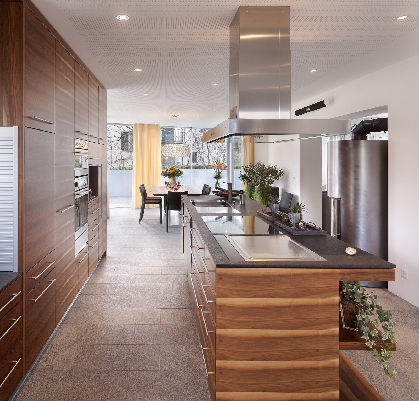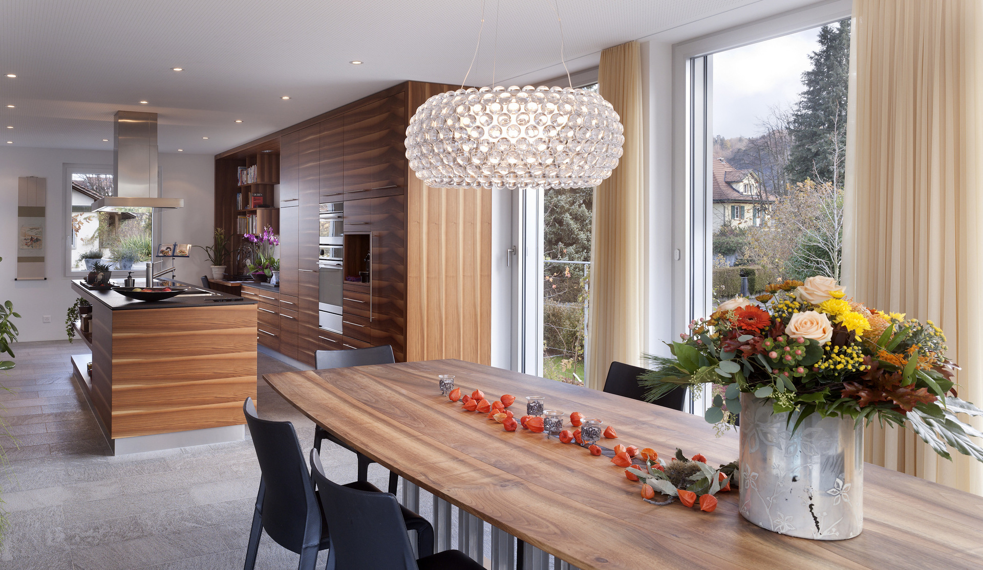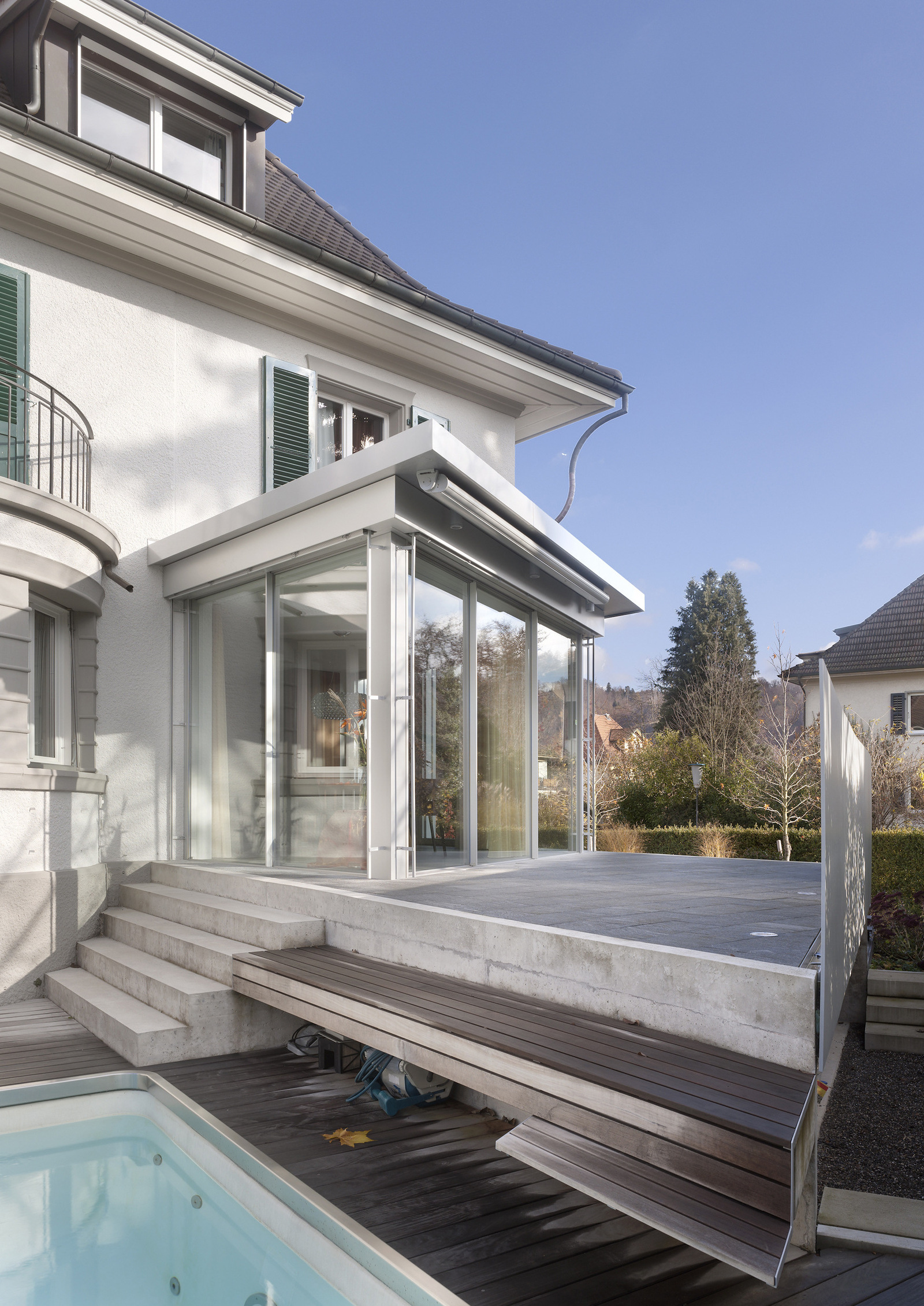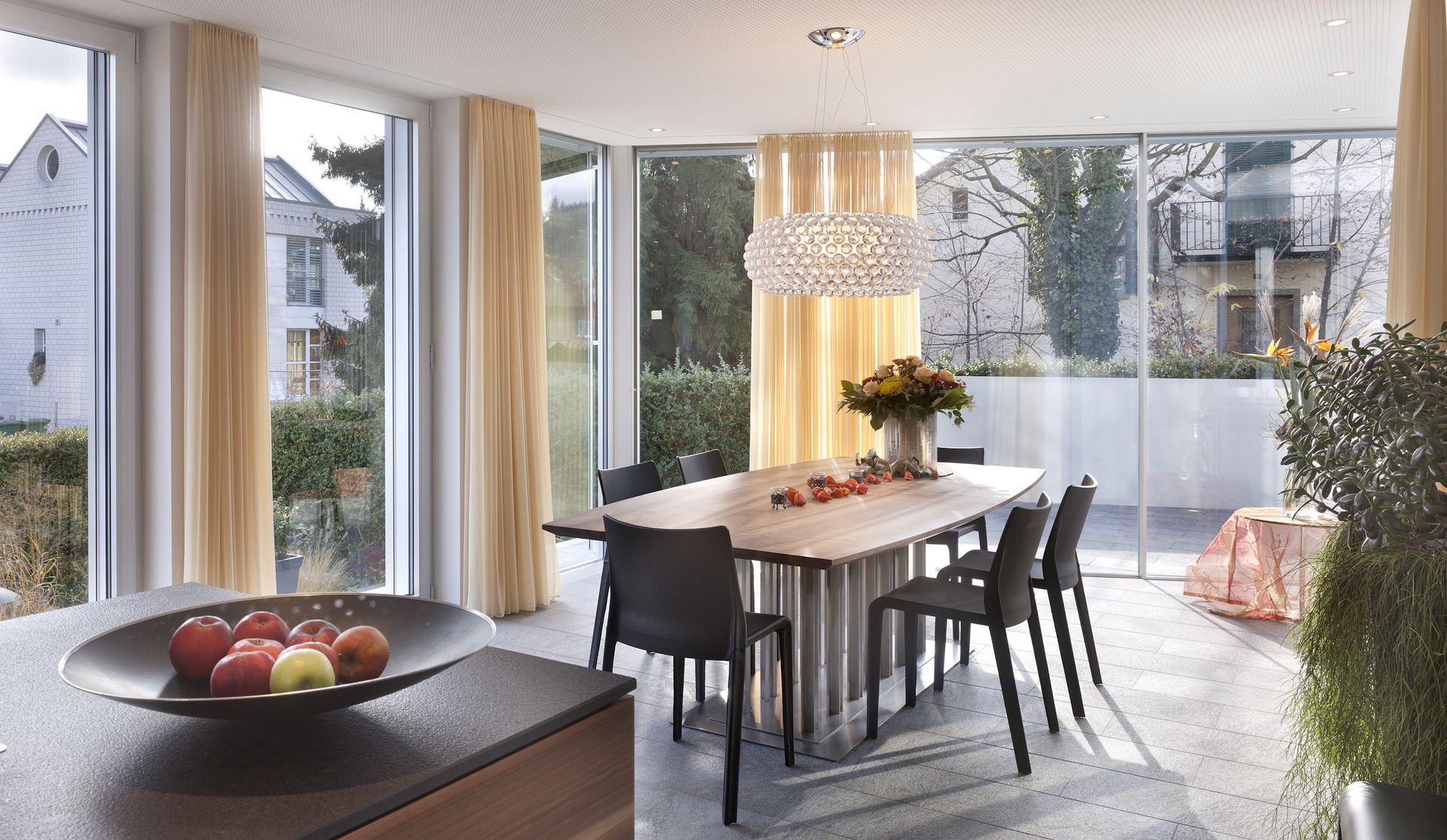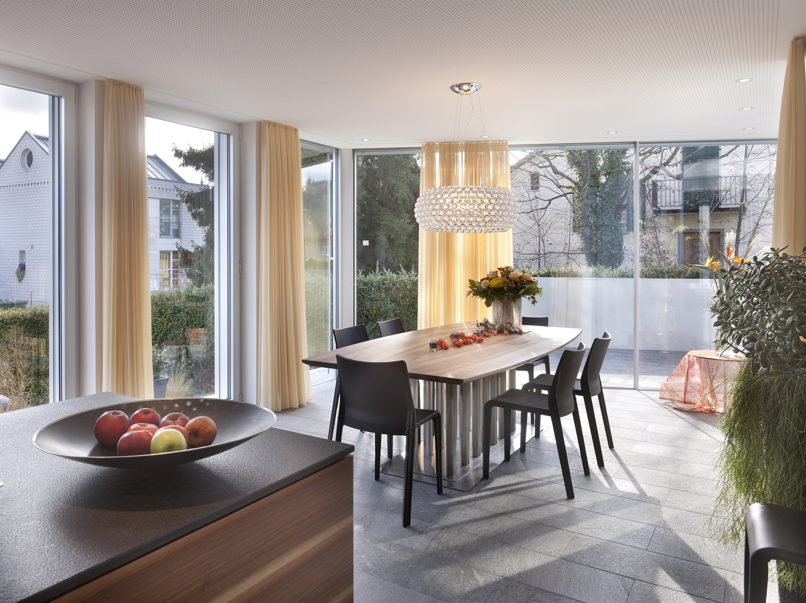 Bei einer bestehenden Liegenschaft wurde der Wohnraum durch einen Anbau erweitert. Der Eingangsbereich sowie die Küche wurden umgestaltet. Die Elemente wurden in einer Zeitgemässen Material- und Formsprache ausgeführt.